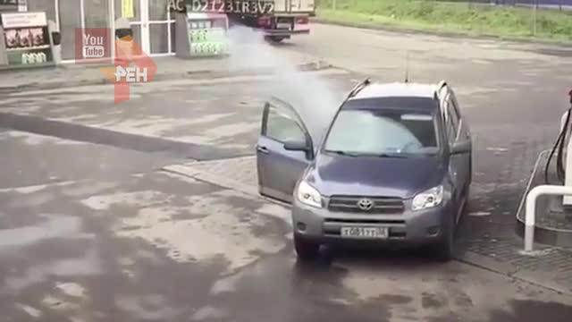 Спустя несколько секунд дверь машины открыла изнутри девушка, однако она не смогла сразу вылезти. Из салона авто шел дым, а на помощь пострадавшей уже спешил сотрудник заправки.