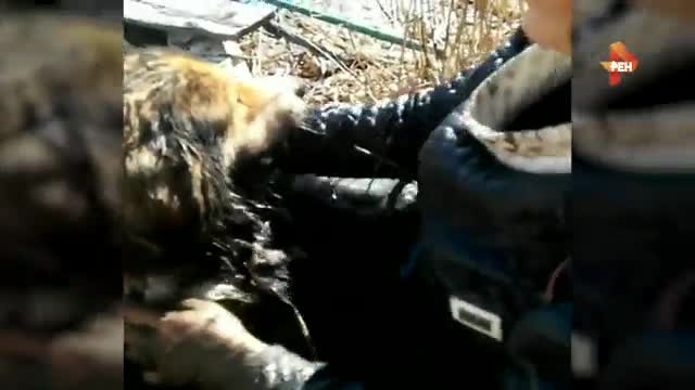 Для спасения понадобилось очень много времени и сил, но достать собаку все же удалось. Судя по всему, пес уже очень давно сидел в болотной тине и не мог выбраться: у животного не двигались задние лапы, и оно было очень истощено.