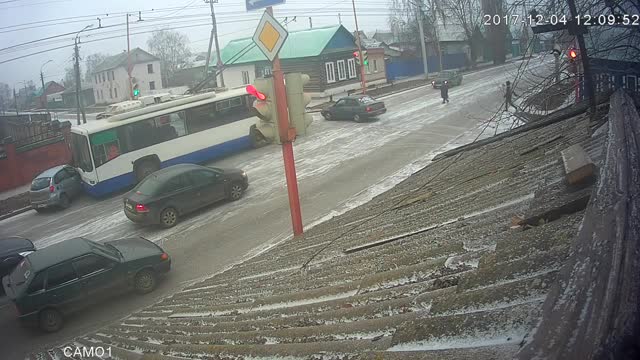 На кадрах видеозаписи видно, как водитель автомобиля марки "Датсун" сворачивает прямо перед приближающимся троллейбусом.