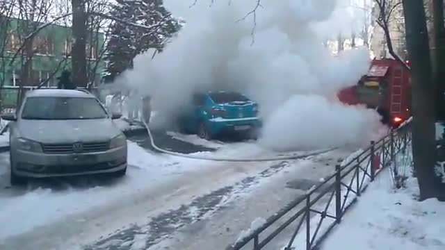 Очевидцы опубликовали в соцсетях видео с места происшествия. На кадрах видно, что спасатели ликвидировали возгорание и огонь не перекинулся на стоящие рядом авто.