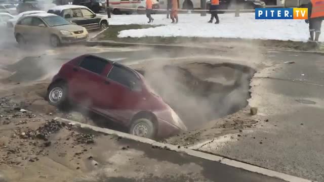 На проспекте Славы в Санкт-Петербурге, где прорыв трубы с кипятком привел к серьезному происшествию, легковушка провалилась под землю, сообщает Piter.tv