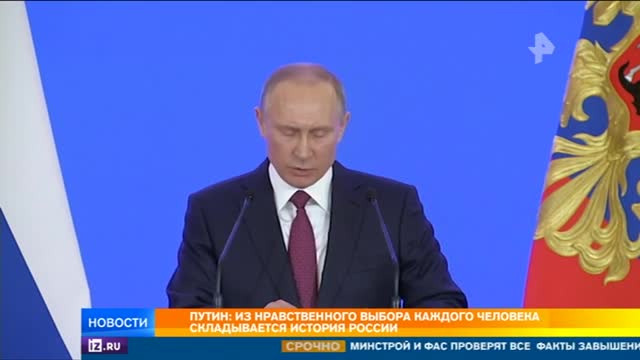 "Именно из таких поступков, из нравственного выбора каждого человека складывается тысячелетняя история России. Хочу сказать большое спасибо каждому, кто сейчас находится в этом зале и кого в этом зале нет, но кто причастен к сегодняшнему празднику, - всем, кто достойно, мужественно выполняет свой долг. Как и наши великие предки, вы своим примером показываете, что такие ценности, как благородство, бескорыстие, преданность отечеству, никогда не утратят своего значения и всегда будут служить надежной опорой сильной великой России", - заявил Владимир Путин.