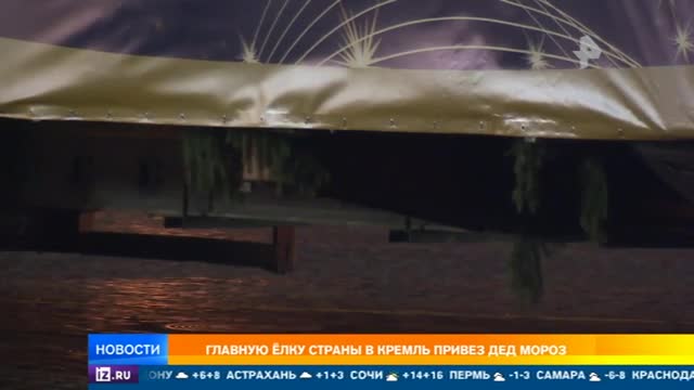 Автопоезд с новогодним деревом по традиции заехал на территорию Кремля через Спасские ворота. Им управлял Дед Мороз. По его словам, транспортировка елки прошла без ЧП, было совершено 2 технические остановки. В этом году высота елки составляет 27 метров, а диаметр 60 сантиметров. Сообщается, что дереву 90 лет.