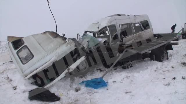 Машина в результате столкновения вылетела с трассы и перевернулась, оказавшись в кювете. На кадрах записи можно увидеть, что микроавтобус получил серьезные повреждения: в результате аварии разворотило кабину и переднюю часть транспорта.