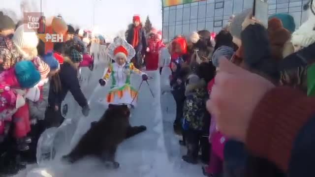 Видео: омский медведь скатился по ледяной горке рядом с детьми
