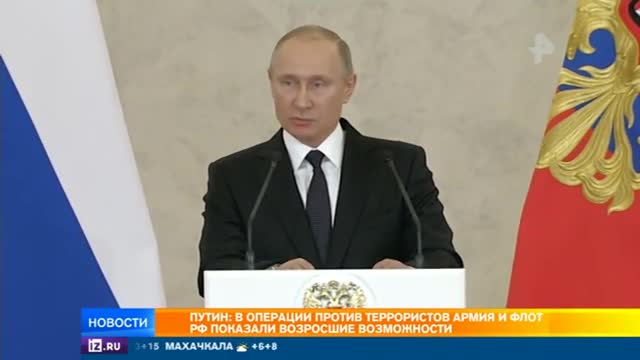 "Армия и флот России в полной мере показали свои возросшие возможности, успешно применяли новейшее вооружение и технику. Летчики ВКС совершили 34 тысячи боевых вылетов, по объектам бандитов нанесено 166 ударов высокоточными ракетами. Сирийская армия при ключевой поддержке наших ВКС и ВМФ освободила от террористов практически всю территорию страны, свыше тысячи населенных пунктов. Ваш героизм и профессиональные действия помогли сохранить сирийскую государственность, остановить массовые убийства, казни, террор в отношении мирного населения, дали возможность приступить к политическому урегулированию конфликта в этой стране, к восстановлению нормальной жизни и возвращению десятков тысяч беженцев", — сказал президент.