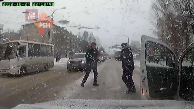 На кадрах ролика видно, как один из водителей агрессивно пытается объяснить другому шоферу, что тот нарушил правила дорожного движения. Через несколько секунд словесная перепалка переросла в драку. Под сигналы автолюбителей мужчины наносят друг другу удары руками и ногами.