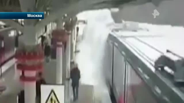 Снежная масса обрушивается на электричку. А затем и на платформу. Одни пассажиры отпрыгивают от ледяной волны. Другие, кажется, не обращают на неё внимания и спешат по своим делам.