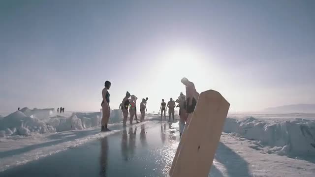 В этом ролике мужчины и женщины в плавках и купальниках ныряют прямо в Байкал. При этом температура воздуха составляет около минус 20 градусов, а вода всего плюс 2 градуса.
