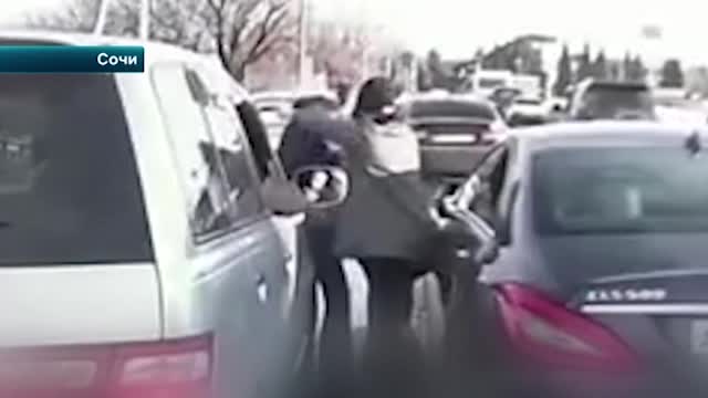 В Сочи две автомобилистки не поделили дорогу. На кадрах ролика видно, что женщина из серебристого минивэна решает разобраться. Она подходит к Mercedes и начинает выяснять с его владелицей отношения.