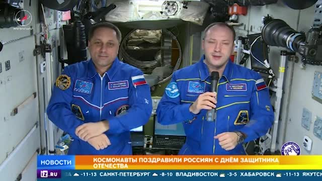 "Коллеги, друзья, поздравляем вас с Днем защитника Отечества - настоящий праздник, кто любит свою страну. Огромное спасибо тем, кто служит родине. Благодаря вам мы спокойно работаем здесь, в космосе. С праздником", - сказали Антон Шкаплеров и Александр Мисуркин.