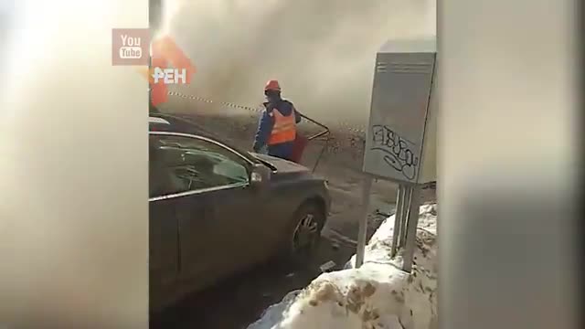 На кадрах видно, как густые клубы пара вынудили водителей остановиться из-за ограниченной видимости.