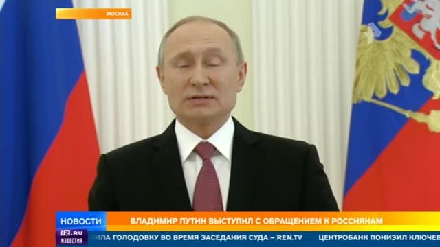 "Я чувствую внутреннюю потребность обратиться напрямую к вам — к тем, кто поддержал мою кандидатуру по всей стране, ко всем гражданам России. Считаю, что такая мощная гражданская активность, ваша ответственность, консолидация чрезвычайно важны, особенно в нынешних условиях, в ситуации непростых внутренних и внешних вызовов, с которыми мы сталкиваемся. Хорошо знаю и о наших проблемах. Вы, граждане России, справедливо говорите о снижении доходов, о недостатках в здравоохранении, ЖКХ, других сферах. Вижу в вашем высоком доверии прежде всего надежду на изменения к лучшему. Рассчитываю, что такая оценка связана и с той работой, которая уже сделана, с теми позитивными результатами, которых мы уже достигли вместе в предыдущие годы. Но этого, конечно, недостаточно. Нам необходим настоящий прорыв, и в вашем активном участии в выборах, в вашей поддержке вижу готовность к такой работе, к таким переменам. Понимаю свою колоссальную ответственность перед гражданами России, перед страной. Все, о чем говорил в ходе избирательной кампании, должно быть сделано. Конечно, мне очень хочется, чтобы те проблемы, которые ставили граждане, были решены как можно быстрее. Мы будем к этому стремиться, но абсолютно безответственно было бы обещать сделать все это немедленно, прямо сейчас, все изменить в одночасье. Это было бы лишь красивым показным жестом, рассчитанным на краткосрочный сиюминутный эффект. А нам нужны последовательные, глубокие перемены, продуманные шаги, которые будут приносить устойчивый, позитивный результат и сегодня, и в перспективе. Мы будем создавать новые рабочие места и наращивать эффективность нашей экономики, повышать реальные доходы граждан и снижать уровень бедности, развивать инфраструктуру и социальную сферу, образование, здравоохранение, решать экологические и жилищные проблемы, обновлять, благоустраивать наши города и поселки, и все это на базе мощного, технологического рывка, который нам предстоит совершить", — сказал российский лидер.