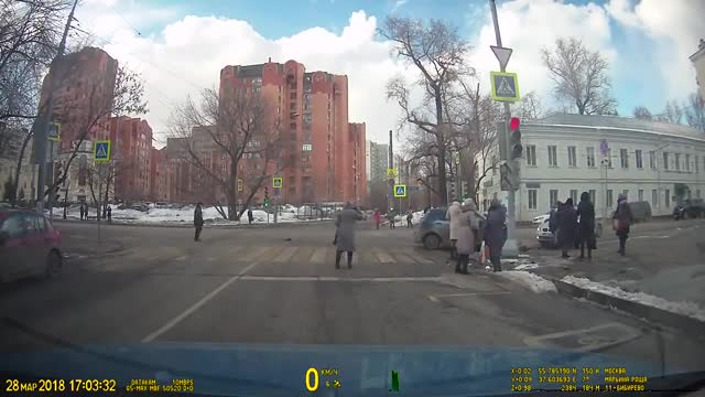 Автомобильный видеорегистратор снял, как полицейский автомобиль чуть не протаранил людей на перекрестке в Москве.