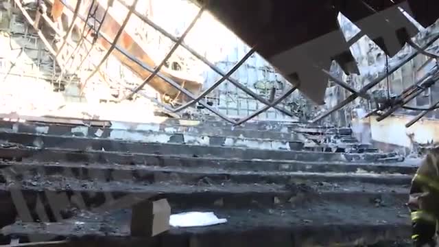 На кадрах — тот самый кинозал. Крыша над ним обрушилась во время пожара. Вся мебель и экран полностью уничтожены.