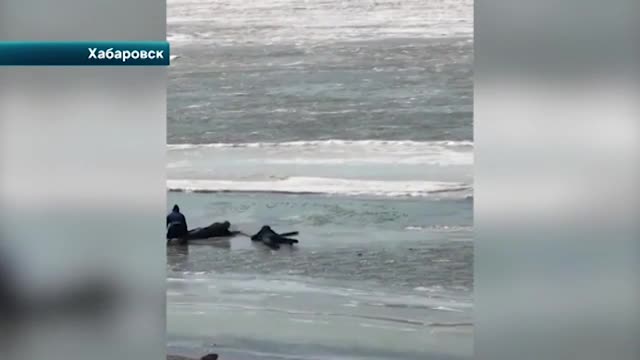Трое жителей Хабаровска спасли пса, провалившегося под лёд.
