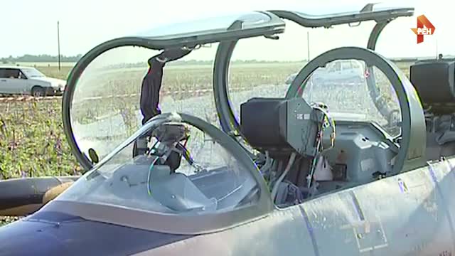 В распоряжении РЕН ТВ появились новые кадры с места жесткой посадки военно-учебного самолета Л-39 в Адыгее. Как видно на кадрах видео, стекло самолета разбито. На корпусе — перья и пух.