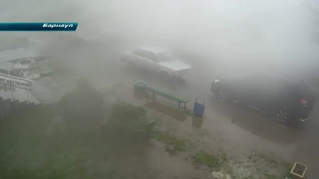 Двор многоэтажки. Пенсионерка идет по дороге, в какой-то момент из-под земли вырывается фонтан горячей воды. Поток смешивается с грязью и заливает все вокруг. Объектив камеры видеонаблюдения мгновенно запотевает. Из-за пара ничего не видно.