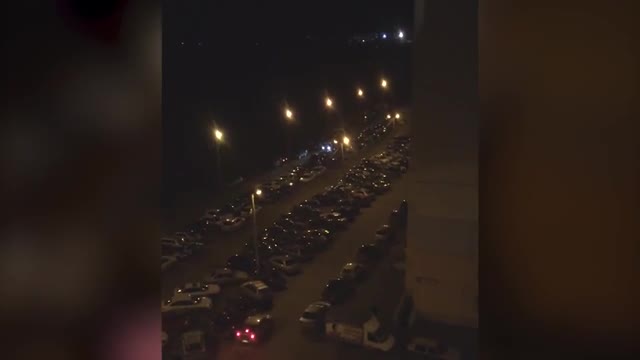 На запись попал салют, мощность которого привела в действие сигнализации огромного числа припаркованных автомобилей, фары которых вместе с гудками устроили своеобразную "светомузыку".