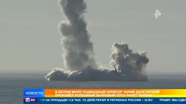 Российские военные осуществили залповый пуск баллистических ракет "Булава" с подводного крейсера "Юрий Долгорукий".