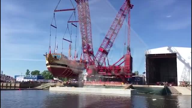 Видео: в Петербурге спустили на воду копию первого линейного корабля Балтийского флота