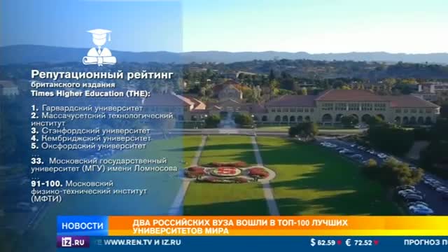 Кроме того, в последнюю десятку попал и наш МФТИ. А вот лидерами списка, как и в минувшем году, стали американские вузы - это член "Лиги плюща" Гарвард, а также Массачусетский технологический университет и Стэнфорд. На первых строчках есть и британские вузы - Кембриджский и Оксфордский. Рейтинг составляется на основе опросов экспертов. На этот раз в нем приняли участие больше 10 тысяч человек едва ли не со всех стран мира.