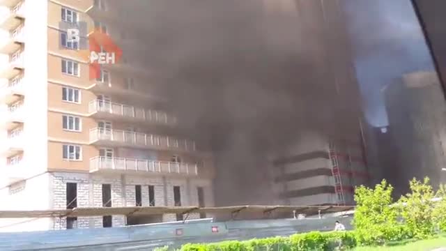 В социальных сетях опубликовали запись того, как над строящимся многоэтажным зданием в Свердловском районе Красноярска поднимается в небо огромный столб густого черного дыма, сквозь который пробиваются языки пламени.