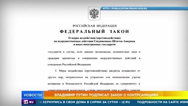 Российский президент Владимир Путин подписал закон "О мерах воздействия на недружественные действия США и иных иностранных государств". Документ размещен на официальном портале правовой информации.