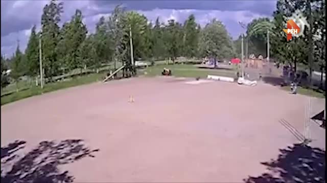 Следственный комитет обнародовал кадры, на которых видно, как порыв ветра сносит батут с двумя маленькими детьми. Инцидент произошел под Петербургом накануне днем.
