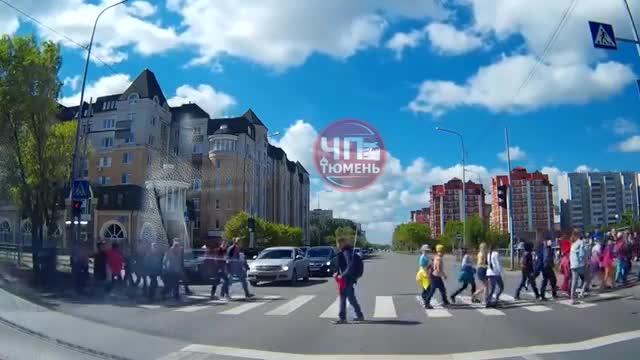 В Тюмени автохам вылетел на встречную полосу и промчался по пешеходному переходу во время движения по ней организованной колонны детей.