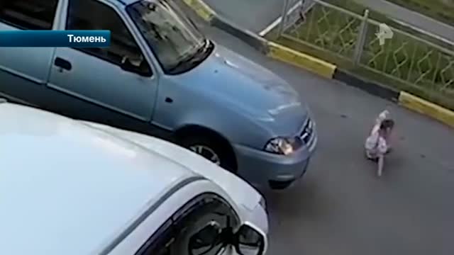 В Тюмени таксист едва не задавил девочку. Машина едет по двору, когда внезапно из-за припаркованных автомобилей выбегает ребенок — прямо под колеса легковушке.