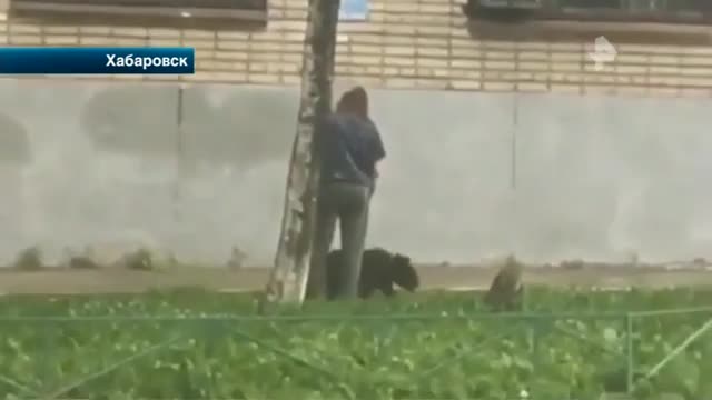 В Хабаровске очевидцы сняли на видео женщину, которая вышла на прогулку с медвежонком. Хозяйка держала его на тонком поводке, словно это собачка, а питомец тем временем резвится в свое удовольствие.