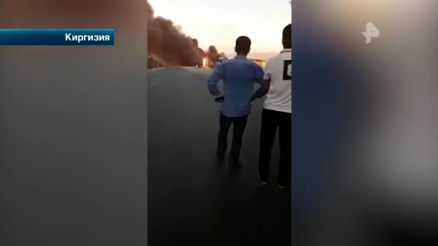 Мощный взрыв прогремел на АЗС на границе Киргизии и Таджикистана. Густой черный дым поднимается в небо, его видно за несколько километров. Очень скоро следует яркая вспышка. Огромный огненный гриб, словно от бомбы, взмывает в воздух. Очевидцы тут же бросаются врассыпную, вероятно ожидают, что сейчас их накроет ударной волной.