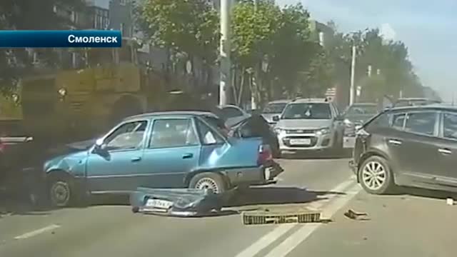 В Смоленске машина перестроилась в соседний ряд и устроила массовое ДТП. Вероятно, невнимательный водитель не посмотрел по зеркалам, прежде чем перестроиться.