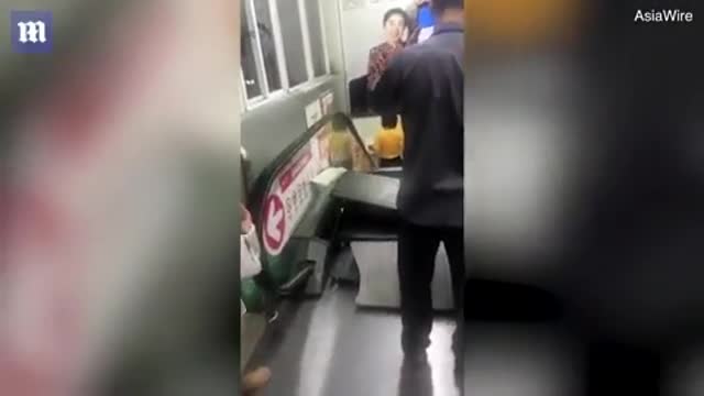 В Китае камера наблюдения сняла, как отец с маленьким ребенком чудом избежал гибели под обломками сломавшегося эскалатора.