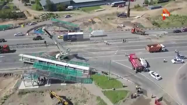 На кадрах, которые были сняты с коптера, видны последствия происшествия. Спасателям удалось убрать обломки перехода и освободить движение в сторону столицы.