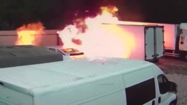 В какой-то момент бензобак взрывается — пламя перекидывается на соседние авто. Примечательно, что машина была новой.