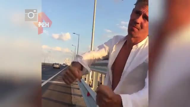 Как видно на кадрах, Панин ползает на четвереньках и целует объект, соединивший Крым и Краснодарский край.