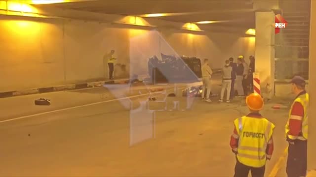 РЕН ТВ публикует видео с места автокатастрофы, произошедшей в Москве, в тоннеле, расположенном в Северном Чертаново.