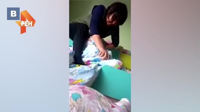 На кадрах видно, как женщина сидит на ребенке и держит его, сжимая одеяло над головой и пытаясь заставить замолчать. Все это происходит под истошные крики ребенка, однако воспитатель на них не реагирует.