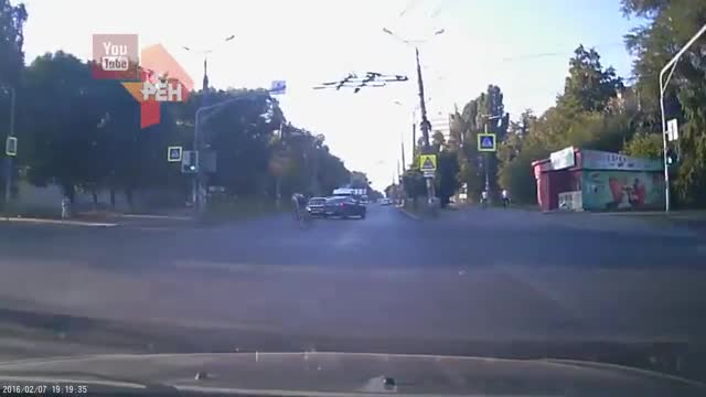 Видеорегистратор одного из водителей запечатлел момент ДТП с участием автомобиля Mazda. На кадрах видно, как водитель, собиравшийся проскочить на "зеленый", в последний момент успевает объехать велосипедиста, однако затем врезается в столб.
