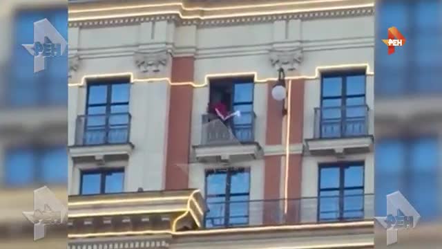 На балконе отеля "Ритц" в центре Москвы Дмитрий Кузнецов изобразил самоубийство. В этом ему помог товарищ.