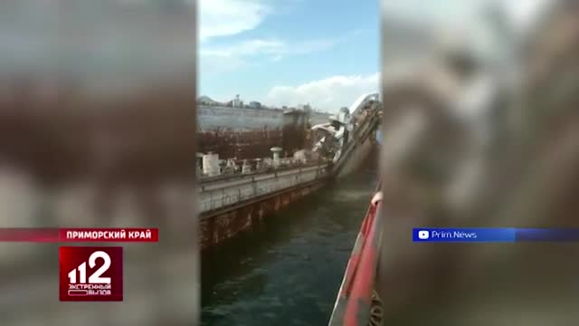 В Приморье башенный кран пополам сломал плавучий док. Падение огромной металлической конструкции на видео сняли очевидцы.