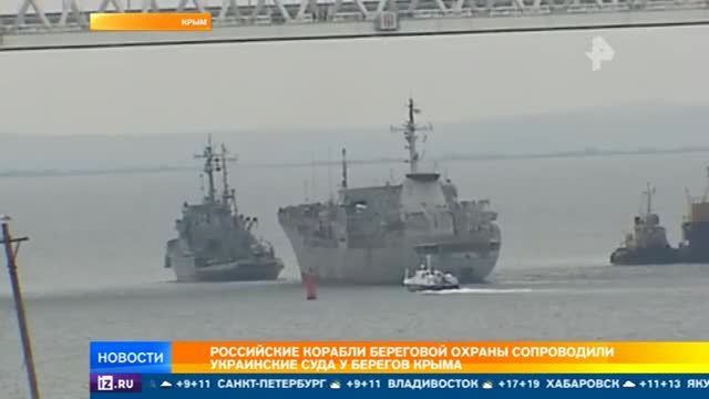 У крымского побережья заметили суда Военно-морских сил Украины. Буксир "Корец" и поисково-спасательный корабль "Донбасс", двигаясь через Керченский пролив, вошли в исключительную экономическую зону России. Наши катера тут же, как это и прописано в нормах международного права, стали их сопровождать. Вместе они прошли под Крымским мостом.