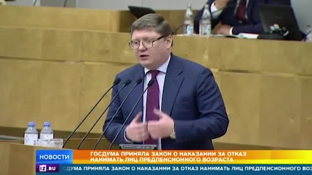 В России официально ввели уголовную ответственность за отказ нанимать работников предпенсионного возраста. Этот законопроект, предложенный президентом, сегодня приняли в Госдуме в третьем окончательном чтении. Согласно ему, работодателю теперь грозит штраф до двухсот тысяч рублей или обязательные работы сроком до 360 часов.