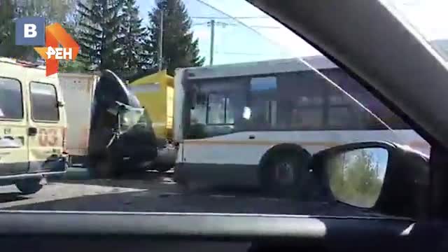 На кадрах видно, что на месте происшествия работают сотрудники экстренных служб. Помимо грузовика и пассажирского автобуса повреждения получила легковая машина.