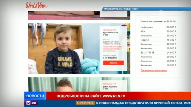 Помогать — очень просто. Достаточно отправить SMS-сообщение на короткий номер 8888, указав в тексте любую сумму, или сделать банковский перевод, воспользоваться кредитной картой. Все реквизиты, инструкции и детальный отчет о переводах есть на сайте worldvita.ren.tv. Еще раз — большое вам спасибо!