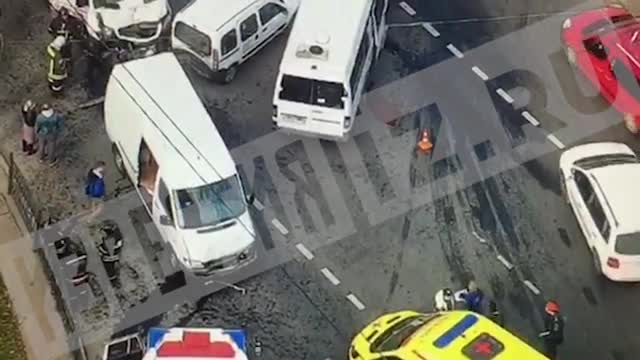 Камеры наблюдения запечатлели момент столкновения маршрутки с четырьмя авто в Москве. В результате ДТП пострадало 11 человек. Инцидент произошел на улице Свободы.