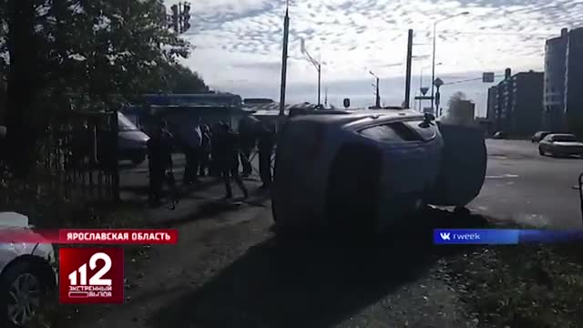 Посреди перекрестка в патрульный автомобиль на огромной скорости влетает иномарка. Машины переворачиваются и летят на тротуар.