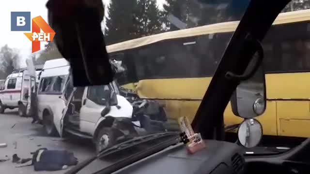 На кадрах видно, что маршрутку буквально смяло после столкновения лоб в лоб.